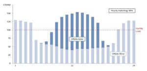 Consider the example of a single day of operations for a 100MW electrolyzer facility that operates as a “flat load” (i.e., the electrolyzer has no ability to curtail its operations). The facility sources its clean power from one offsite wind and one offsite solar facility, as shown in Figures 1 and 2.