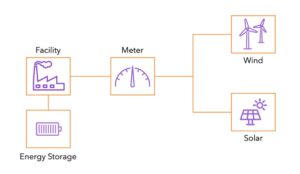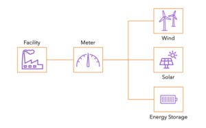 Figure 3: A green hydrogen facility, behind-the-meter energy storage asset, the facility’s power meter, and offsite wind and solar
