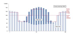 In this case, the BTM storage asset discharges during periods when the variable renewable resources are unavailable to match the facility’s load. The storage asset brings the CFE score up to 100%.